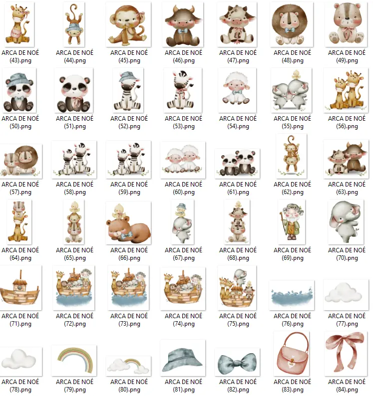 Encante-se com este maravilhoso conjunto temático inspirado na história da Arca de Noé, com ilustrações em estilo aquarelado que trazem delicadeza e charme aos seus projetos criativos.