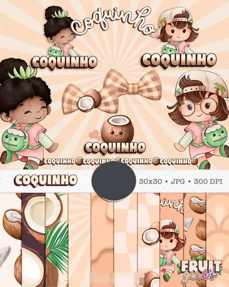 Kit Digital Boneca Cute Frutinhas Coco Aquarelado PNG