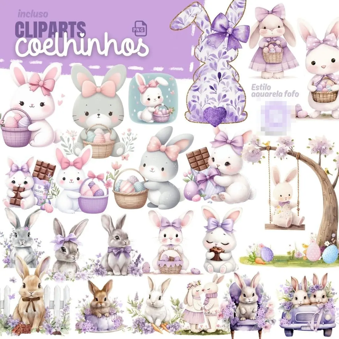 Apresentamos um conjunto temático completo para suas criações especiais, com elementos delicados na paleta lilás, inspirados na celebração da Páscoa.